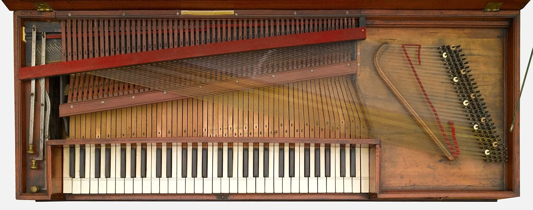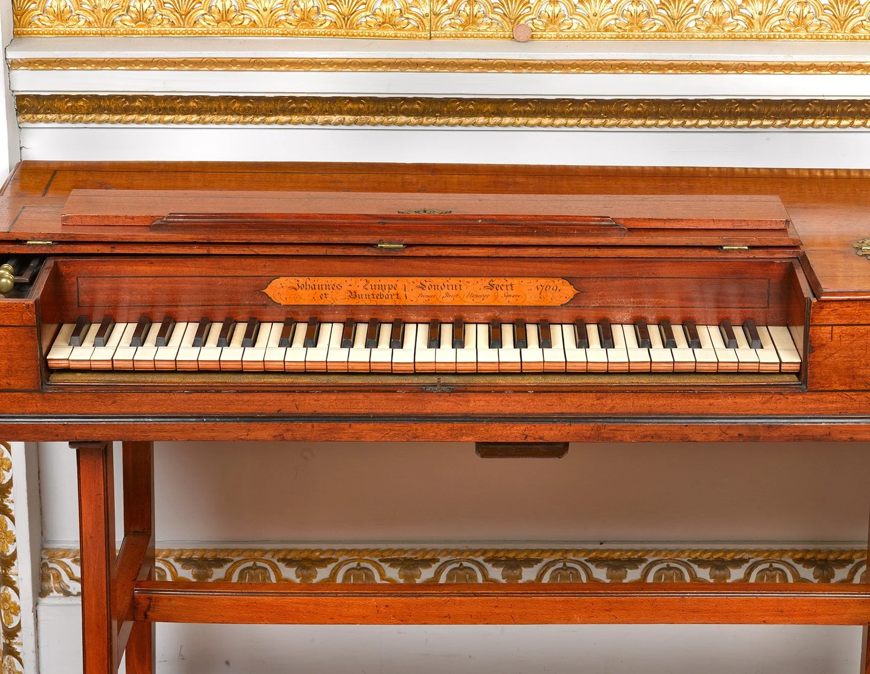 Technically, these instruments commonly used what organological literature often describes as the English single action: a straightforward mechanism engineered for reliability and economy rather than for the later grand ideal of repetition and power. In a typical early Zumpe, hand stops could operate dampers in separate regions (treble and bass), offering control over resonance. Just as importantly, the model proved socially portable. Many makers and collections note how quickly the Zumpe pattern was taken up by other workshops and how broadly it circulated through subcontracting in London, as well as export and imitation across Europe.