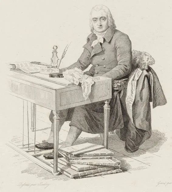 André-Ernest-Modeste Grétry, in a portrait commonly dated c. 1788, shown at a small French square piano with 3 pedals.
